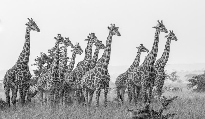 Tower of Giraffe Gathering in Rain